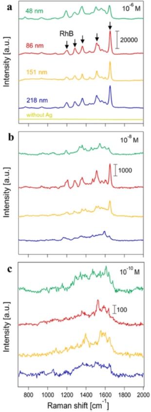 ?显示了不同浓度的罗丹 B(分别 10??0? 10?0M),用四种纳米银微粒(尺寸分别 48?6?51 218nm 时)获得 SERS 光谱。在罗丹明浓度为 10?M 时,采用四种纳米银微粒获得的谱图 500-1700 cm?处都均能清晰地观察到罗丹 B 的所有特征峰(?a)、strong style="box-sizing: border-box;">?列出了罗丹明 B 的拉曼特征峰归属。其中,1649 cm?处的 C-C 伸缩振动信号最为强烈,因此被用作计 AEF,用于评价拉曼信号的增强情况。在未采 SERS 增强时,没有观察到罗丹明 B 的特征峰(?a),这证实了纳米银微粒对罗丹明 B 的拉曼信号起到了增强作用、/p>
