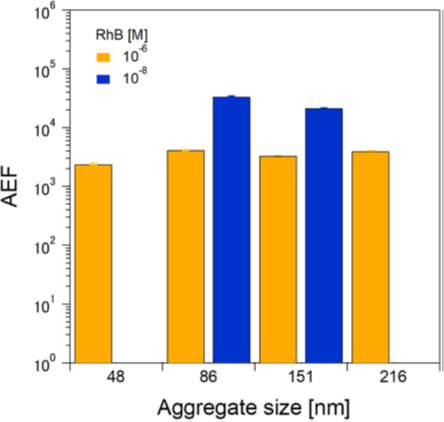 ▱/span>?,粒径为 48?6?51 218nm AgNP 微粒 浓度 10-6 10-8M 罗丹 B AEF 值。部分测试未获得罗丹 B 特征峰,因此未计 AEF 倻/span>