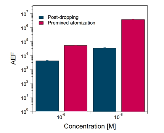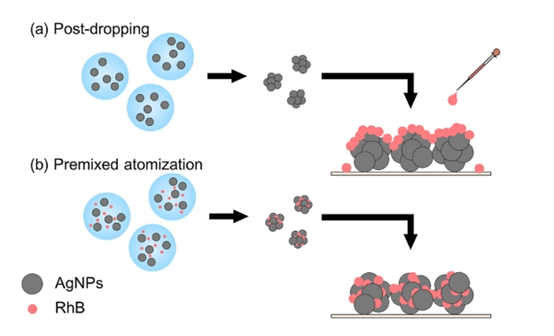 本研究采用喷雾干燥方法制备纳米微粒用于探针分子的痕量分析。首先,研究者采用定制化的喷雾干燥系统制备纳米微粒。之后研究制备的银纳米微粒的大小如何影响探针分子(罗丹明B)的 SERS 信号。最后,我们雾化了银纳米粒子和探针分子罗丹明 B 的预混合溶液,以促进探针分子在热点的捕获,从而进一步增强探针分子拉曼信号、/p>
