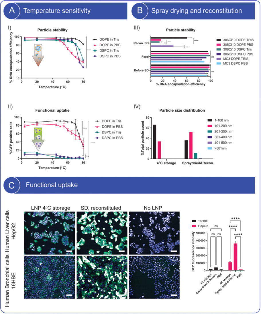 (B) DSPC 替换 DOPE、PBS 替换 Tris 时,喷雾干燥和重新分散后LNP颗粒的稳定性显著提高、/p>
