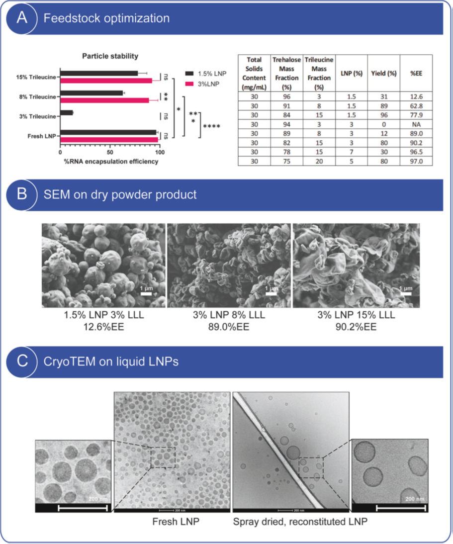 该团队发现,当喷雾干 LNP 制剂时,在干燥塔内可观察到均匀的薄膜,在旋风分离器中可观察到薄膜沉积物,这是因为在无赋形剂的情况下,喷雾干 LNP 制剂中每种成分的固化机制将根据其扩散速率和溶解度而有所不同,引起各组分分离。因此该团队优化 LNP、海藻糖、三亮氨酸的比例[2]。发 LNP 与三亮氨酸的比例 1:4 1:5 时,可以减少旋风分离器中的粉末损失,并进一步提高复溶后 mRNA 封装效率,将 LNP 负载 1.5% 增加 5%。喷雾干燥后,通过 SEM 分析粉末粒径和表面结构,通过 CryoTEM 分析复溶的颗粒。发现喷雾干燥后复溶 LNP 样品为尺寸范围变化更大的致密小囊泡(?)、/p>