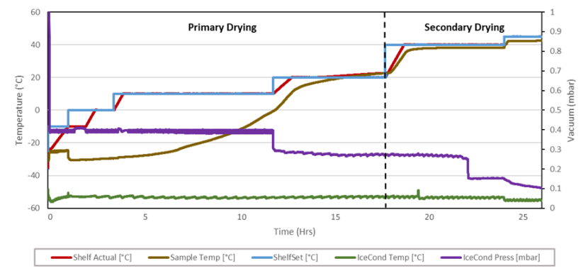 ?中的图表清晰地区分了初级干燥和次级干燥两个阶段。冷冻干燥约 15 小时后,样品温度接近层板温度,表明样品中的大部分水分已通过升华除去。这是因为层板提供给样品的能量不再被升华所消耗。因此,样品温度 17 小时程序初级干燥结束时的层板温度相同、/p>