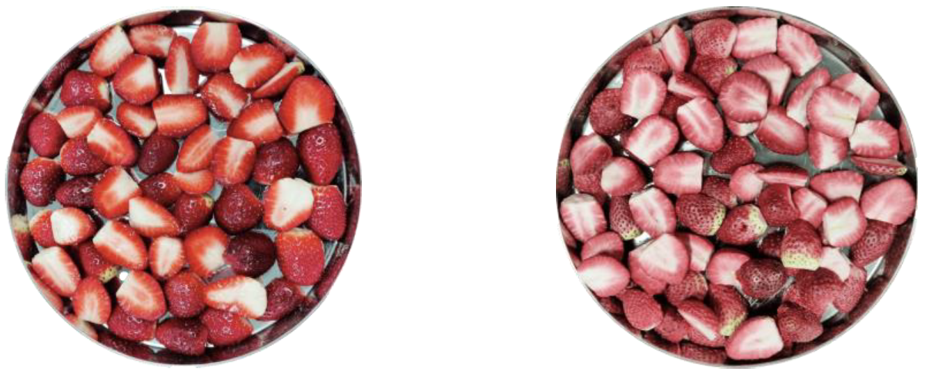草莓被切成两片,草莓片放在不锈钢托盘上。为了监测草莓样品的温度,温度传感器被放置在一片草莓的内部。装有样品的托盘和层板在 -25°C 的设定温度下冷冻过夜、/p>