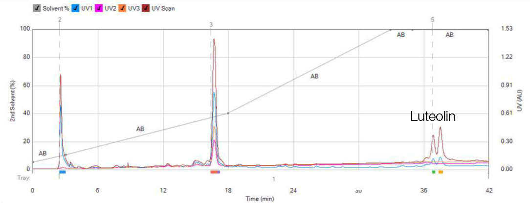 采用传统 Prep HPLC 方式虽然可以将木犀草素从紫苏提取物中进行分离,但是制备时间较长且流动相损耗量较高,无论从时效性还是经济效益角度出发,都不是最佳的选择、/strong>