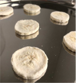 将香蕉切 5mm 厚的切片,并将这 11 片香蕉切片放置在不锈钢托盘上(图1(/strong>,然后在深冷冰箱中过夜,温度 -40℃。另外也可以使用 -20 的冰箱、/p>