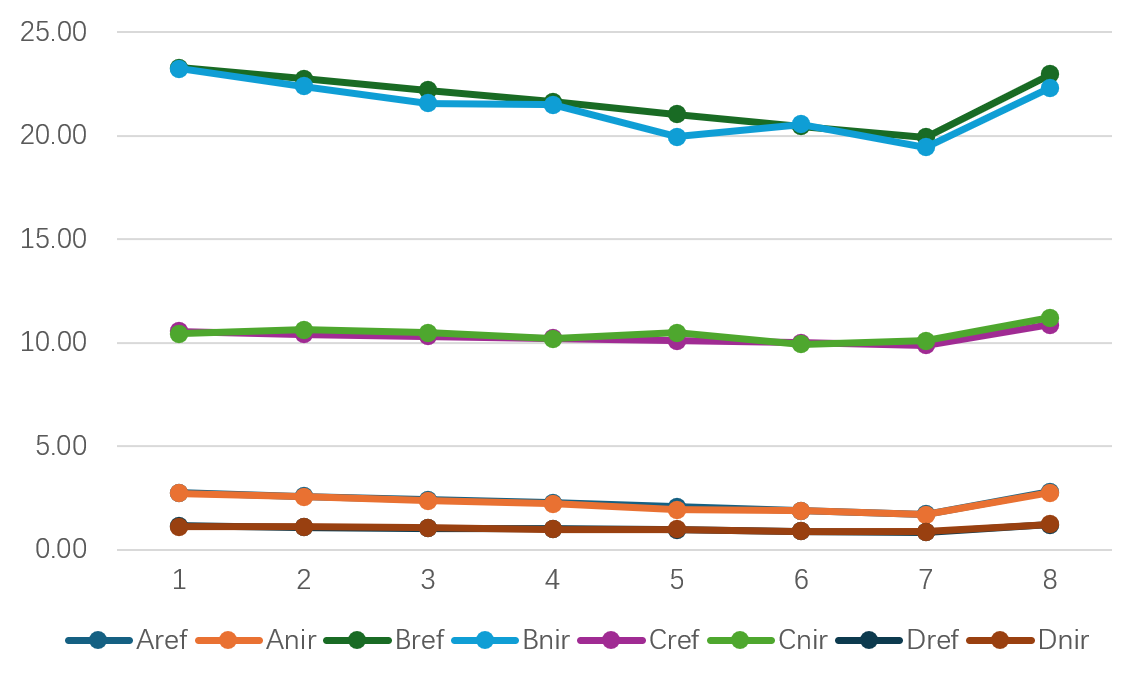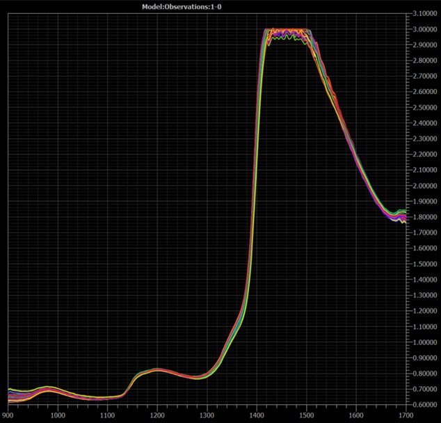 27 个浓缩糖液样品使 ProxiMate 测量其近红外光谱,液相色谱分析其 A、B、C、D 四种糖分的含量,测得的光谱如下图所示: