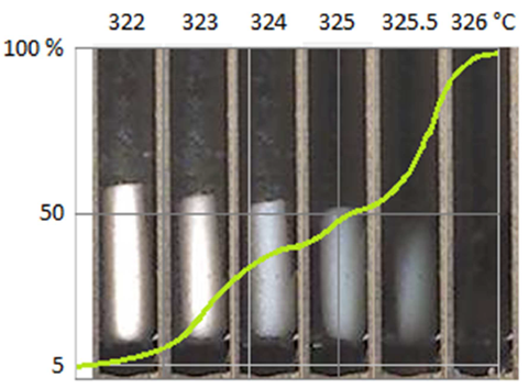 ▱/span>? 所示。聚四氟乙烯的熔化过程。绿色曲线表示熔点软 Melting Point Monitor1.2 记录的相应熔化等级。熔点范围为 322.9±0.4°C ~ 326.0±0.1°C、/span>