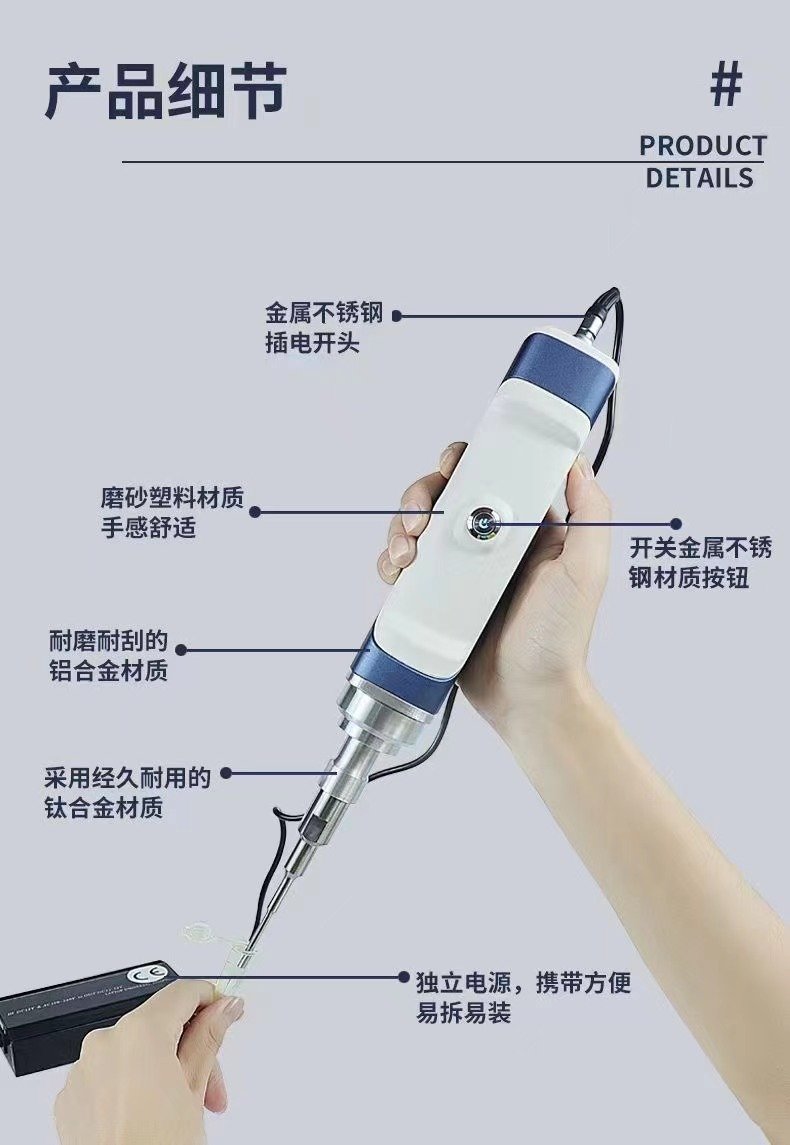 3、机身材料选用的优质的铝模搭配注塑模这样的结构方式,这样既保证了机器的牢固性和金属质感又能体现整机的轻便和时尚,变幅杆采用钛合金材料制作,具有强度高、声速高,耐蚀性好、耐热性高等特点,从而延长仪器的使用寿命:/p>