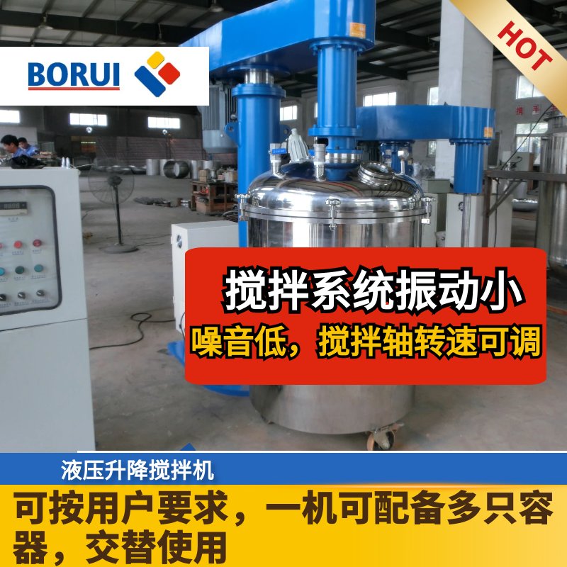 “液压升降搅拌机是对多种混合液体、固体进行搅拌溶解、分散、均质的高效设备。主电机为调速电机,调速范?0-1200?分,中速作搅拌溶解用,高速作分散均质用。物料在叶片的高速转动作用下,在容器内上下剧烈翻动,与叶片产生碰击和剪切,使聚集体破坏达到迅速分散、均质混合,加速溶解。该设备广泛用于涂料、颜料、油墨、粘胶剂等有关化工产品的生产。“/p>