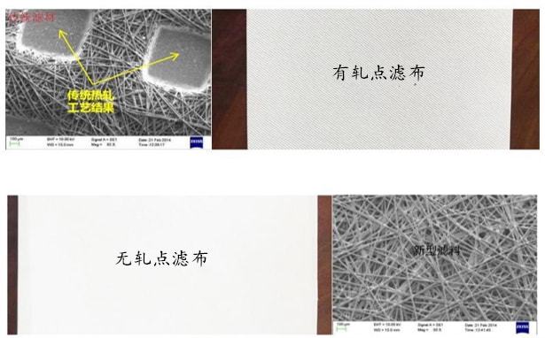 据张总介绍,现在市场上做滤筒用的聚酯纤维滤材是通过热轧工艺来定型,分布在基材表面的轧点有效的防止了滤布分层+/span>但轧点处会造成纤维塑化,降低了滤料的透气性。赛弗研发工程师通过对纤维材料的改良,独特的PWOP粘合纤维工艺,无需通过轧点定型,也能保证滤材的不分层,从而提高了滤料的透气性。无 点基材卓越的透气性能为在基材表面覆更高等级的PTFE膜创造了条件。SAVPWOP滤料在过滤等级达 欧标H14级时,仍保证滤料相对较低的初始阻力。在环保排放标准越来越严格的环境下,SAVPWOP滤料更是滤筒除尘器首选过滤滤料!