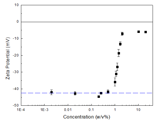 ?. 不同浓度下的医用脂肪乳高浓度样品的Zeta电位测试一直是用户的关注点,而如何阐释测试结果也是困惑用户的问题之一。颗粒体系的Zeta电位取决于颗粒表面的化学组成和溶液环境,例如pH,盐的种类和浓度,表面活性剂等等添加物的种类和含量。在一个稀释的浓度下,Zeta电位和颗粒物的含量之间没有必然联系,然而当体系浓度超过一个临界浓度时,需要考虑到颗粒所携带的电荷对于环境的贡献、颗粒之间的相互作用力等