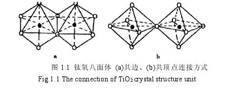 1.1.1 晶体结构常见 Ti O2 晶体结构有板钛矿、锐钛矿和金红石。板钛矿是亚稳相,几乎不具有催化性能,应用极少,没有工业利用价值。金红石和锐钛矿晶型常用作光催化剂,钛氧八面体是其基本组成结构。两种晶体结构之间的差别主要是八面体间的连接方式不同,锐钛矿的结构是八面体共边,而金红石的结构则是八面体共顶点并且共边,如图1.1 所示。锐钛矿相和板钛矿相在常温下最稳定,都为低温相,在高温时向金红石型