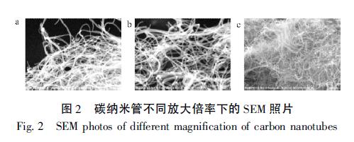 通过采用XRD 测试分析了碳纳米管晶体结构,如图1 所示。通过SEM 测试( ?) ,在不同放大倍率( 50. 0 k?0. 0 k?5. 0 k) 下,可以看出碳纳米管生长分布均匀,直径在30 ?0 nm,长径比适中的碳纳米管可以有效地与活性物质硫相结合,在反应过程中可以有效地抑制多硫化物的“穿梭效应”、/p>