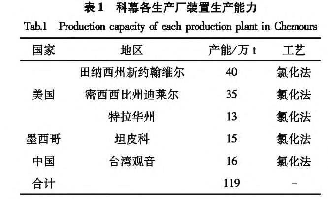 科幕公司(原杜邦公?成立?802年,是美国最大的化工公司。科幕公司是世界领先的聚合物、特种氟化学品、车用涂料、高级电子材料供应商,是世界上最大的二氧化钛生产商。科幕公司于20世纪30年代步入钛白行业?959年利用其多年开发的技术,在田纳西州新约翰维尔建成了世界第一座氯化法工厂。此后,科幕公司又开发了利用二氧化钛品位只有60D/伊70%的钛铁矿一金红石一钛白石混合矿为矿源的氯化法工艺。目前,科幕公司共有五座钛白粉工厂,全部采用氯化法工艺,具体产能布置如表1所示、/p>