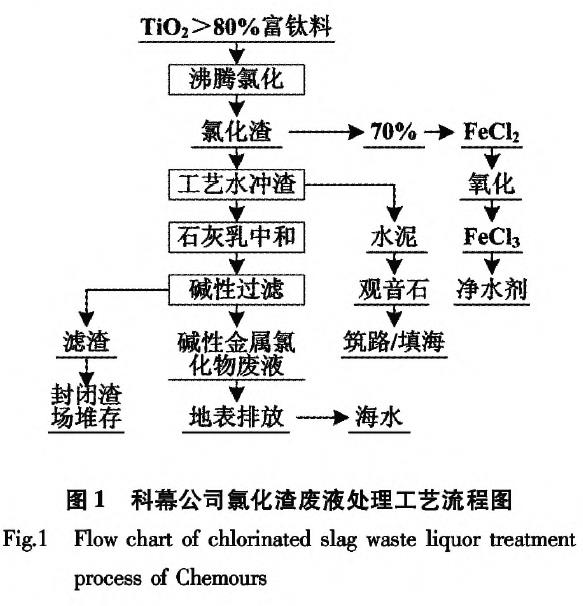 科幕公司氯化废渣处理有三种方式uJ:①石灰中和、滤饼堆放;②深进灌注;③制成观音石,表面固化后作路基材料。其中,深井灌注工艺要求地质构造合适,若为地震带风险很大,不能普遍推广。因此,仅美国密西西比州法律允许科幕钛白粉工厂采用了这种氯化废渣的处理工艺。科幕公司氯化法钛白粉生产过程产生的氯化渣石灰中和、滤饼堆放技术如?所示。氯化渣主要采用制作成滤饼堆放和填埋,含氯离子废液处理后排人海中、/p>
