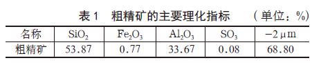 试验地点在中国高岭土有限公司中试车间和剥片车间,试验原料为茂名某公司的?50mm 水力旋流器溢流粗精矿,粗精矿的主要理化指标见?、/p>