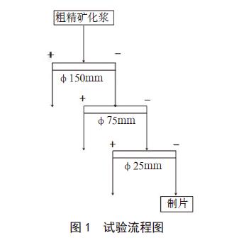 首先将粗精矿化浆,矿浆浓度控制在16% 左右,然后依次采用?50mm、?5mm、?5mm 水力旋流器分选,压滤出?5mm 溢流干矿。接着对其进行化浆,加入适量分散剂,矿浆浓度控制?5% 左右,最后采用砂磨机进行剥片,试验流程见?、/p>