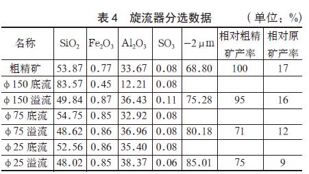 在表2 的工作参数下,旋流器分选数据见?。分析表4 可知:?50mm、?5mm、?5mm 水力旋流器对粗精矿起到了很好的分选作用,铝含量从33.67% 提升到了38.37%?2μm 粒度?8.80%提升到了85.01%、/p>