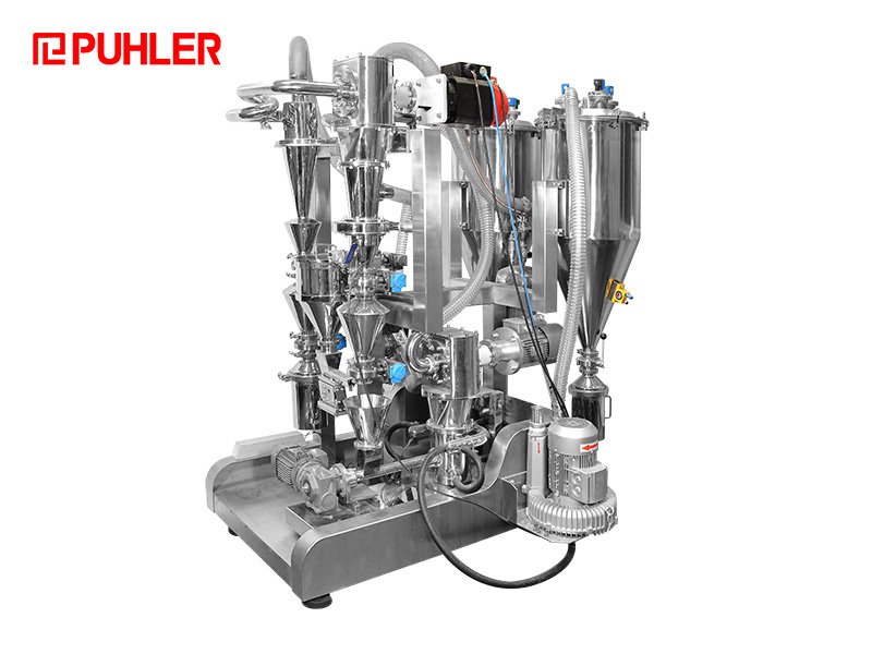 流化床气流磨是压缩空气经拉瓦尔喷咀加速成超音速气流后射入粉碎区使物料呈流态化(气流膨胀呈流态化床悬浮沸腾而互相碰撞),因此每一个颗粒具有相同的运动状态。在粉碎区,被加速的颗粒在各喷咀交汇点相互对撞粉碎。粉碎后的物料被上升气流输送至分级区,由水平布置的分级轮筛选出达到粒度要求的细粉,未达到粒度要求的粗粉返回粉碎区继续粉碎。合格细粉随气流进入高效旋风分离器得到收集,含尘气体经收尘器过滤净化后排入大气、br style="box-sizing: border-box;"/>