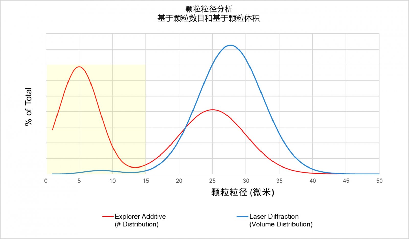 上图表显示了对相åŒç²‰æœ«é‡‡ç”¨ä¸¤ç§ä¸åŒæŠ€æœ¯åˆ†æžçš„结果对比。从高亮显示的区域å¯ä»¥çœ‹å‡ºï¼Œè¾ƒå°çš„颗粒数é‡éžå¸¸æ˜¾è‘—ï¼ˆè§æ•°é‡åˆ†å¸ƒï¼‰ï¼Œè€Œè¿™äº›é¢—粒的的体积贡献相当低(è§ä½“积分布(ü/p>