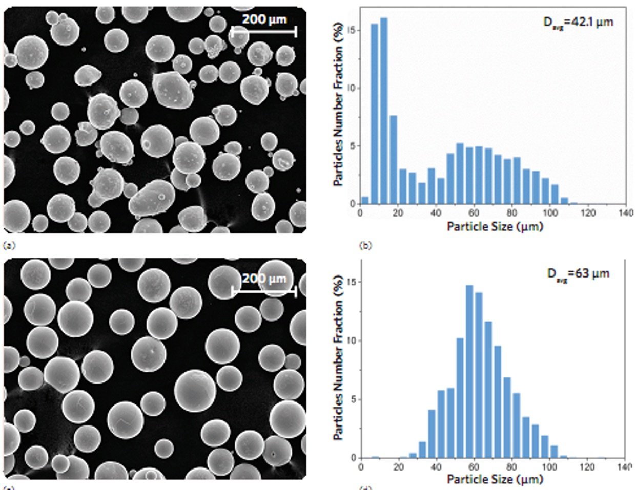 对供应商 A (a, b) 和供应商 B (c,d) Ti-6Al-4V 粉末使用扫æç”µé•œèŽ·å¾—çš„äºŒæ¬¡ç”µå图åƒåŠå¯¹åº”的颗粒粒度分布ã€ü/p>