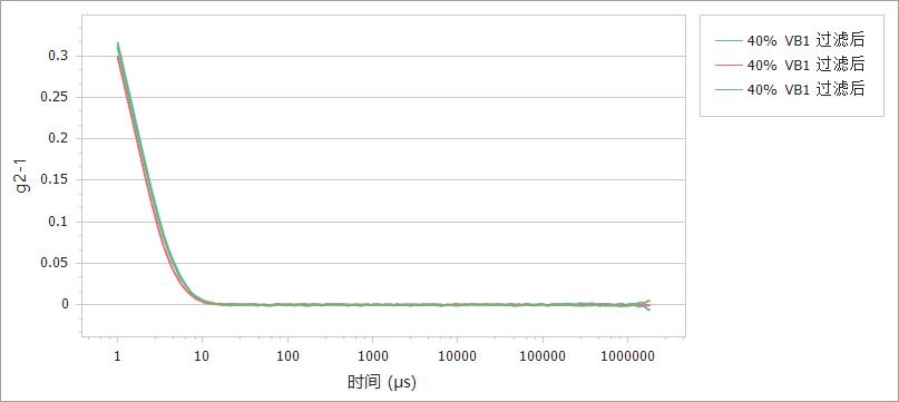 ?是过滤后的维生素B1样品相关曲线,从?可以看出,相关曲线呈一次衰减,衰减速度变得极快,在10 μs左右就衰减到基线,这是由于小颗粒样品较快的布朗运动速度决定的,且排除了大颗粒的影响。图5是过滤后样品的粒度分布曲线,峰值在1 nm左右。图4和图5说明220 nm 的PES水性滤膜能有效去除维生素B1溶液中大颗粒团聚物对测试结果的干扰,从而得到合理的粒度结果、/p>