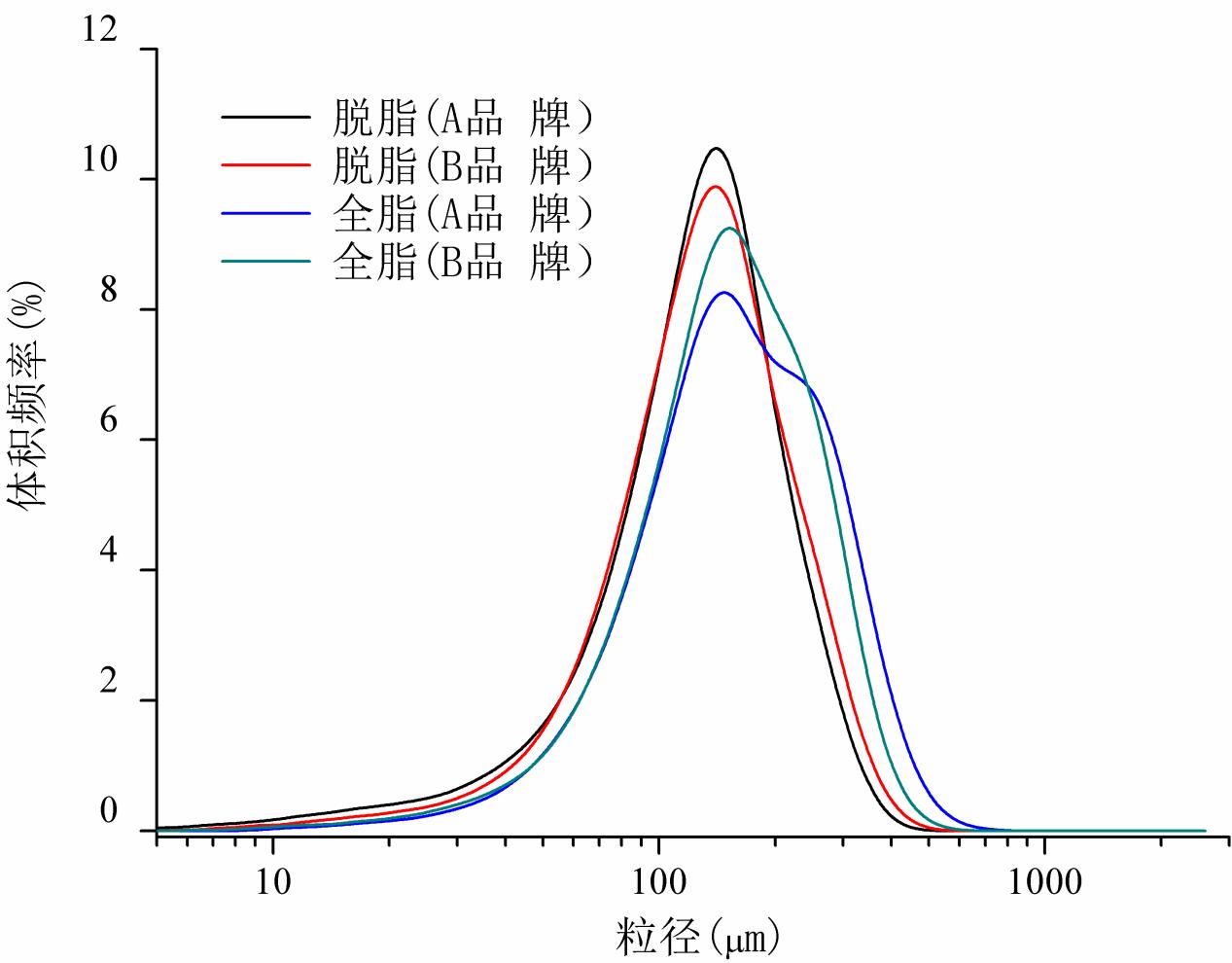 在乳粉的生产过程中,使用激光粒度仪能精确地评估乳粉的粒度。本文通过选择不同品牌(A品牌和B品牌)的脱脂乳粉和全脂乳粉,考察乳粉脂肪含量的差异对乳粉粒度分布的影响、/p>