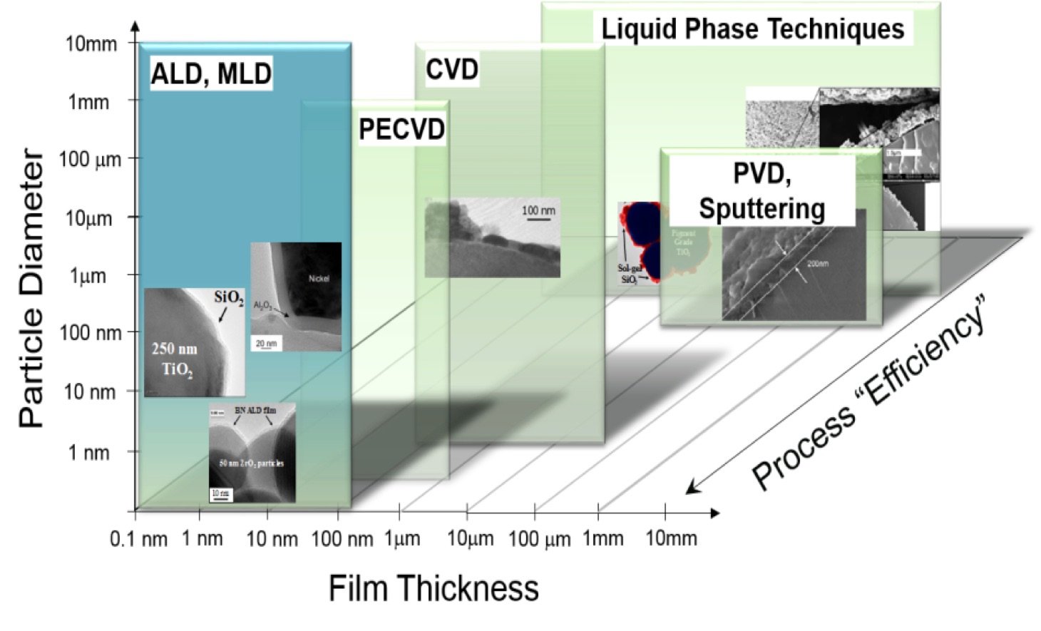 各类包覆技术对于涂层厚度控制以及适用的颗粒粒径范図/p>