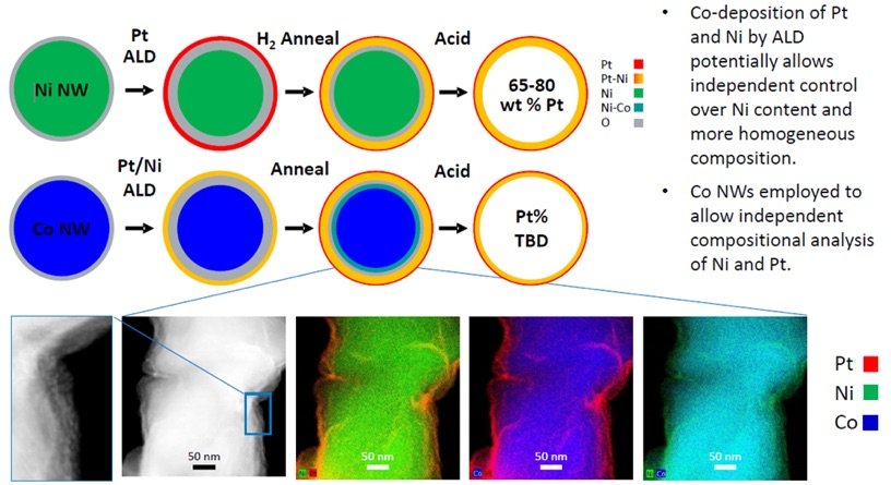 在另一项同样来自美国国家可再生能源实验室的研究中,使用高通量 ALD 技术构 Pt 催化剂涂层,可实 Ni / Co 纳米线材料的高效催化,并防止金属元素浸出损[2]、/p>