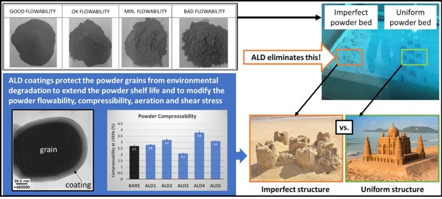粉末冶金利用粉末材料铸造型材,这对粉末材料的流动性和分散性有较高的要求。在粉末熔融的过程中,团聚颗粒以及天然氧化层中的杂质对于最终型材的质量会有较大影响。通过 ALD 技术进行粉末包覆后,材料的抗侵蚀,耐潮性,流动性有明显改善,同时涂层成分的变化还可以赋予粉末功能,如改变其反射率,亲水性等,扩大应用场[3]、/p>