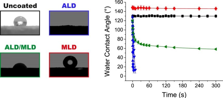 药物粉末尤其 API,通常为无定形或水合物状态,极易发生团聚。通过 ALD 包覆,可有效改善其分散系和流动性,这对于吸入式药物制剂的研发有重要的促进作用。药物亲水性的调控对其在人体体液中的释放有积极意义, ALD 只需几个周期的涂层就可实现不同亲水性或亲油性的样品包覆、/p>