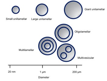 脂质体是一种主要由磷脂组成的具有脂质双层壁的球状囊泡,亍/span>60年代初被发现。脂质体尺寸从几十纳米到超过200微米不等。脂质体有两种类型:单层和多层(囊泡)。多层囊泡进一步分为多层、寡层和多囊泡脂质体(见下图)。其易于制造及生物相容性使它们成为活性药物成刅/span>(API)以及化妆?/span>[1]和食品配方的理想载体[2]、/span>