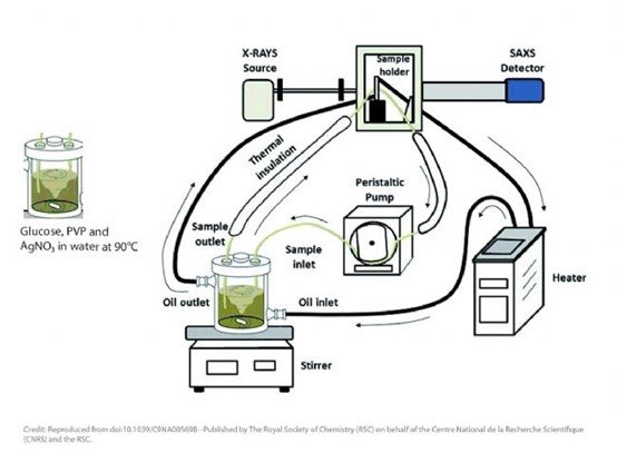 1:用于跟踪具有原位SAXS表征的银纳米粒子形成的实验示意图。SAXS仪器是Xenocs的Xeuss 2.0,配备GeniX 3D铜靶光源和Pilatus 300K探测器、/span>