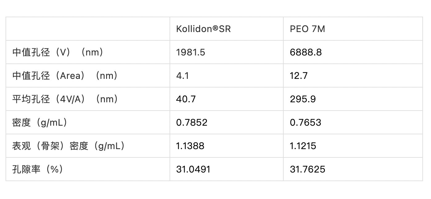 孔隙率和孔径分布的数据如下图、表,聚合物的选择影响了片的孔径分布。两种片孔隙率和密度接近,但从孔径分布可以看出Kollidon®SR处方存在更小的孔。这种差异可能由于两种聚合物的形貌不同。Kollidon®SR颗粒粒径更小,结构中空且颗粒表面有沟壑;而PEO 7M粒径更大、形状更不规则、/span>