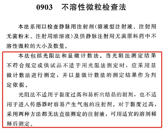 第一:当光阻法测定结果不符合规定或供试品不适于用光阻法测定时,应采用显微计数法进行测定,并以显微计数法的测定结果作为判定依 、/p>