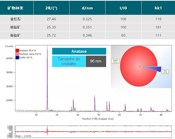 下表为金红石、锐钛矿和板钛矿皃/span>XRD主衍射峰数据,可以看到虽然金红石和锐钛矿在结构上有共同相似的特点,但由于金红石与锐钛矿的最强衍射峰一个在27.46°'/span>/2Ө)左右,一个在25.35°'/span>/2Ө)左右,因此将两者可较轻易区分开来。部分板钛矿的最强峰与锐钛矿的最强峰接近,但根据传统的三强法仍能将两者区分开?/span>[3]、/span>