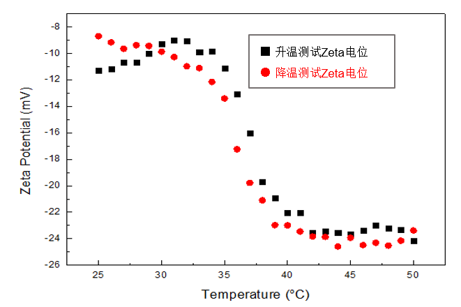 ?中展示了PNIPAm水凝胶的Zeta电位随温度变化曲线。可以看到在检测温度范围内PNIPAm水凝胶eta电位为负值,说明这个样品携带负电,Zeta电位绝对值随着温度升高逐渐增大。在25℃时,PNIPAm的Zeta电位约为-10 mV,而当温度上升?0℃时,其电位上升到约-24 mV。升温过程和降温过程,样品的Zeta电位对于温度的依赖性基本一致、/p>