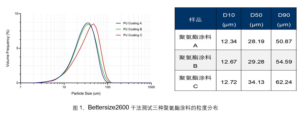 粒度分布的测试方法有很多,激光衍射法测量速度快、动态范围宽、代表性好,是粉末涂料行业中的主流测试方法。根据进样方式的不同,激光衍射法还分为干法和湿法两种。干法以空气为分散介质直接测量干粉的一种方法,其优点是操作快速、简单且干扰因素较少。为避免液体介质的影响带来的不确定性,粉末涂料粒度测试中常常选用干法。图1是Bettersize2600激光粒度分析仪干法测试三种聚氨酯粉末涂料的粒度分布结果、/p>