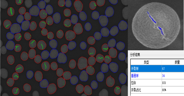通过汇鸿LIBMAS,可快速统计并计算开裂球占比,获得开裂球裂缝信息,从而改善工艺条件,如图二、br/> 正极颗粒内部通常是二次球颗粒形成的多晶结构,我们将二次球颗粒抛开,发现循环充放电后的颗粒截面出现大量裂痕,如图三。使用LIBMAS对截面孔隙进行识别,快速获得截面孔隙结果、/span>