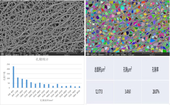 汇鸿LIBMAS可以快速获取隔膜的孔隙率信息,检测隔膜孔隙率、孔隙直径及纤维直径并统计分析,从而形象地描述隔膜表面的结构细节,提高锂电池隔膜孔隙率评定的准确性,如图九、/span>