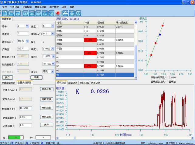 样品测试:于原子吸收光谱仪波?66.5nm处,使用空气-乙炔火焰,以水调零,测量试液的吸光度,减去随同试料的空白试验溶液的吸光度,从工作曲线上查出相应的钾浓度、/span>