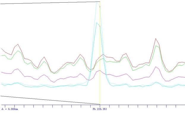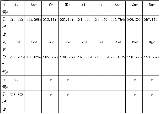 根据ICP软件谱线库提供所有元素不同谱线,首先选择被测元素灵敏度高 的谱线,其次考虑不受样品基体及被测元素相互之间干扰小的谱线的原则,选择分析线如下、/span>