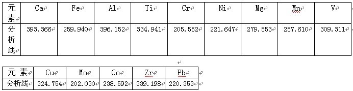 根据ICP软件谱线库提供所有元素不同谱线,首先选择被测元素灵敏度高的谱线,其次考虑不受样品基体及被测元素相互之间干扰小的谱线的原则,选择分析线如下、/p>