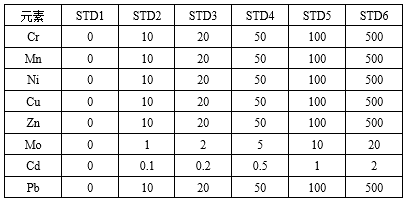 利用逐级稀释法,采?span style="box-sizing: border-box;line-height: 25px">1%硝酸溶液,按?span style="box-sizing: border-box;line-height: 25px">2配制各待测元素标准溶液,且加?span style="box-sizing: border-box;line-height: 25px">Rh元素作为内标(最织span style="box-sizing: border-box;line-height: 25px">Rh浓度20μg/L)、/p>