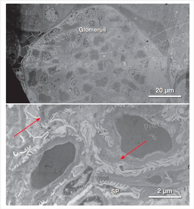 上图为被肾小囊(Bowman's capsule)包裹的正常肾小球的超微结构 STEM 图显示了正常肾小球毛细血管袢和肾小球系膜,与 TEM 下的微观图像类似(Moss and Shore?002)。STEM 图中的红色箭头处清晰显示了肾小球基底膜、系膜基质、系膜胞质、足细胞足突的细节以及与基底膜毗邻的裂孔结构。STEM 图像显示了高分辨的超微结构,图像衬度明显,可以快速捕捉到极小的细胞变化,并快速分析感兴趣部位的微观结构、/p>