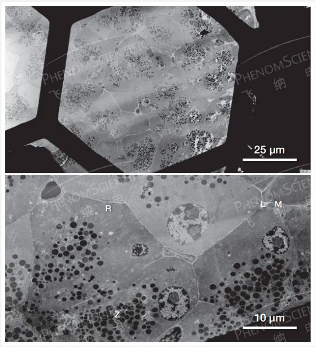 正常的小鼠胰腺腺泡细胞结 STEM 图。图中显示了酶原颗粒(Z)、液泡、线粒体(M)、腺泡腔(L)和粗面内质网(R)。上图为胰腺星形细胞,下图为内质网的精细结构、/p>
