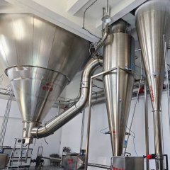 处理量达2000Kg/h,干粉产量达600Kg/h,因水解蛋白为热敏性物料,温度不能超过50度,我司技术团队针对其物料特性,迅速作出的反应,改变以往普通压力喷雾的设计方案,供料及雾化方面,我司采用高压柱塞泵,它具有运行可靠,压力波动小的特点,特别适用于压力喷雾干燥系统工况。蒸汽系统我公司采用特殊的制作工艺,细分为三个换热过程,充分利用过热蒸汽的特点,达到既节能,双能保证较高的出风温度的目的。系统进风温度通过智能控制器实现自动恒温,保证产品质量稳定。干燥阶段,我司采用雾化的液滴与热风同时从塔顶进入喷雾干燥塔,将水蒸汽与系统空气充分混合,控制其露点温度,防止水蒸汽在系统内部结露成水珠。为减少塔内挂粉情况,塔体下锥体采用镜面板制作,并安装空气振打器。由于物料不能承受高温,下锥体采用冷却结构,防止干粉在高温下影响质量。另外为便于清洗,塔体设三层清洗门,并设有照明系统,内壁均抛光处理、/p>