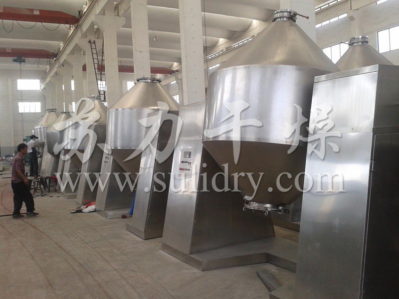 2 、双锥回转真空干燥机产业品质好,与常规方法相比,所加工的产业品质有较大幅度的提升。由于湿分在汽化过程中温度与蒸汽压力成正比,故真空干燥时,物料中的湿分在低温下就能汽化,达到低温干燥,特别适用于有热敏性物料的药品生产。真空干燥可消除常压热风干燥易产生的表面硬化现象,这是因为真空干燥物料内和表面之间压差大,在压力梯度作用下,水分很快移向表面,不会出现表面硬化、/span>