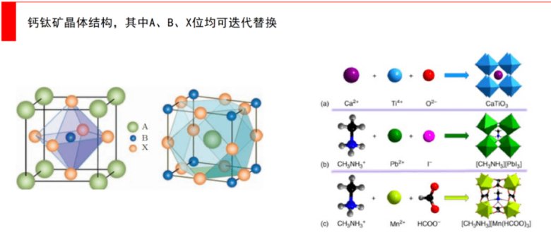 钙钛矿(perovskite),这个有点拗口的名字取自俄罗斯矿物学家Perovski,作为光伏材料的钙钛矿,实际上和钙、钛、矿三个字都没太大关系,这是一类与钙钛矿(CaTiO3)晶体结构类似的“ABX3”化合物,被称为继第一代晶硅、第二代薄膜之后的第三代光伏电池技术路线、/p>