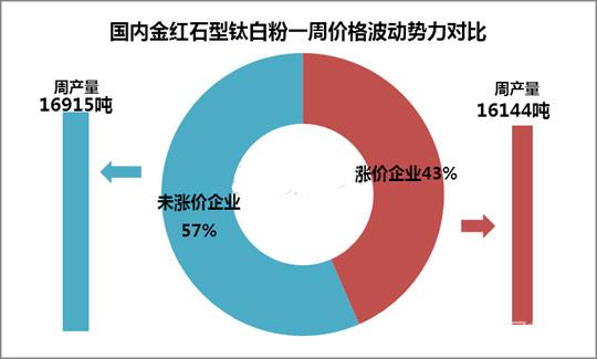 由以上数据可见,采集规模以上金红石型钛白粉生产企业样本数量为23家,其中涨价数量10家,未涨价企业数?3家,未涨价企业数量相对较多。如果按照产能及开工率核算来看,本周钛白粉产量中,涨价产量?6143.7吨,未涨价产量为16915.1吨,基本持平。分析可见,本轮国内金红石型钛白粉涨价与未涨价的双方实力对比基本持平。回?014年钛白粉的六轮涨价,无一不是四川龙蟒带动领涨,而到?015年,为何出现了四川龙蟒未涨,而已有半数涨价的情况?分析认为,钛白粉涨与不涨,归根结底还是市场说了算,虽然部分龙头企业凭借规模优势话语权较强,但在目前行业整合、集中度不断提升的背景下,其后的佰利联、中核钛白等规模也在不断提升,势必将会逐步争夺更多的定价话语权。单从本轮行情来看,市场供需基本面及当前价位实际上是能够支撑价格上行,但是迫于部分企业出于维系客户保证出货质量方面考虑,价格仍难实现整体全上涨。后期来看,钛白粉涨价仍将由市场主导,预计中短线仍存在一定上行趋势,金红石型钛白粉主流商谈价格有望逐步?2000?吨及以上水平靠拢、/div>